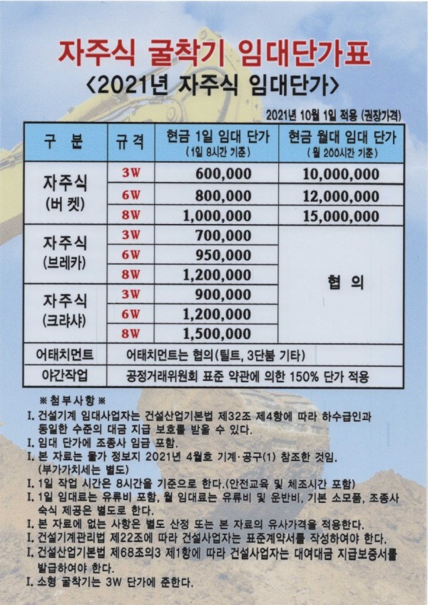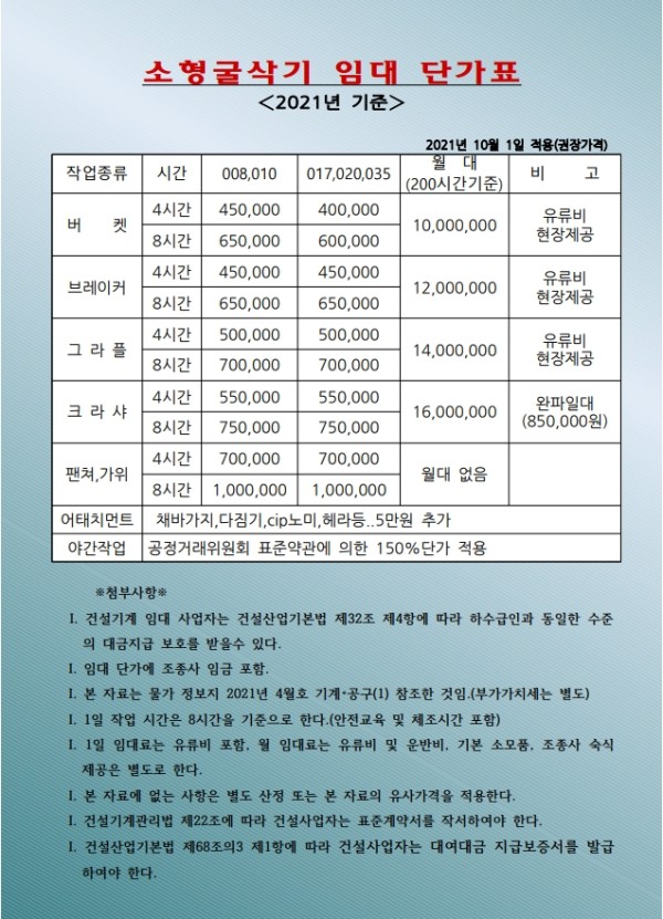 자유 분류 21년 10월 01일부터 적용 될 장비임대단가표 작성자 정보 두레지킴이 작성 작성일 2021.08.05 19:57 컨텐츠 정보 5,439 조회 목록 본문 자주식(타이어)굴삭기 임대단가표이며 2021년 10월 01일부터 시행 SNS 공유 관련자료 이전 22년 04월 14일부터 자동차 검사료 상향 작성일 2022.05.16 21:14 다음 자동차 VS 초등학생 자전거 교통사고 작성일 2019.05.11 07:48 댓글 0 등록된 댓글이 없습니다. 로그인한 회원만 댓글 등록이 가능합니다. 목록